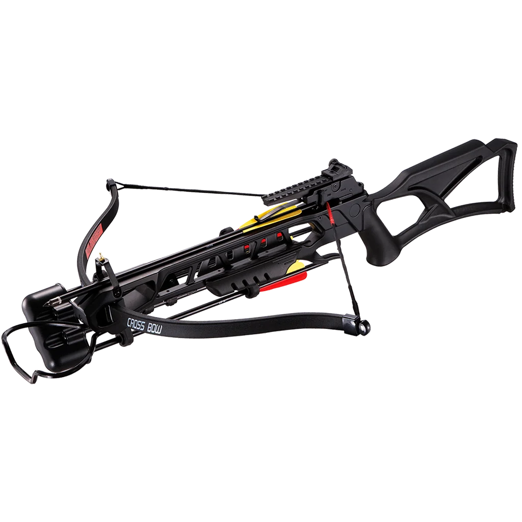 The Man Kung MK-XB23BK Anaconda recurve crossbow is a lithe model with a draw weight of 175 LBS. Targets up to 50 meters can be hit accurately with a velocity of up to 245 FPS (75 m/s), making it one of Man Kungs strongest recurve crossbows! Long shooting sessions are a breeze with this marvellous crossbow, as its weight is only just over 2KG. That’s not the only benefit of this model though: the MK-XB23BK has a 20 mm Picatinny rail on top, which means that the included red dot can easily be swapped out. Comes with the following accessories: a red dot, sling, quiver, cocking strong, stringer and 4 Man Kung 16 inch aluminium crossbow bolts.
