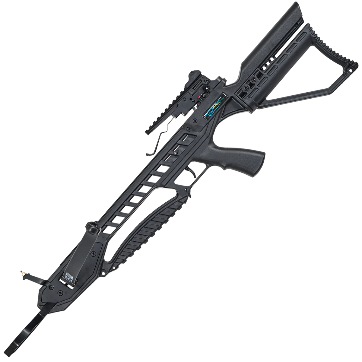 The Man Kung MK-XB21BK is the black version of the MK-XB21GODC. Only topped by the Man Kung Brandon models (MK-185BK and MK-185FC), these two models are amongst the most powerful recurve crossbows of Man Kung. Due to its compactness this MK-XB21BK is very easy to store. It is featured with an adjustable stock to match your posture. Its adjustable sight is mounted on a Picatinny rail, so you can easily attach accessories like the red dot that comes with this crossbow. This MK-XB21BK is equipped with an automatic safety to avoid injuries.