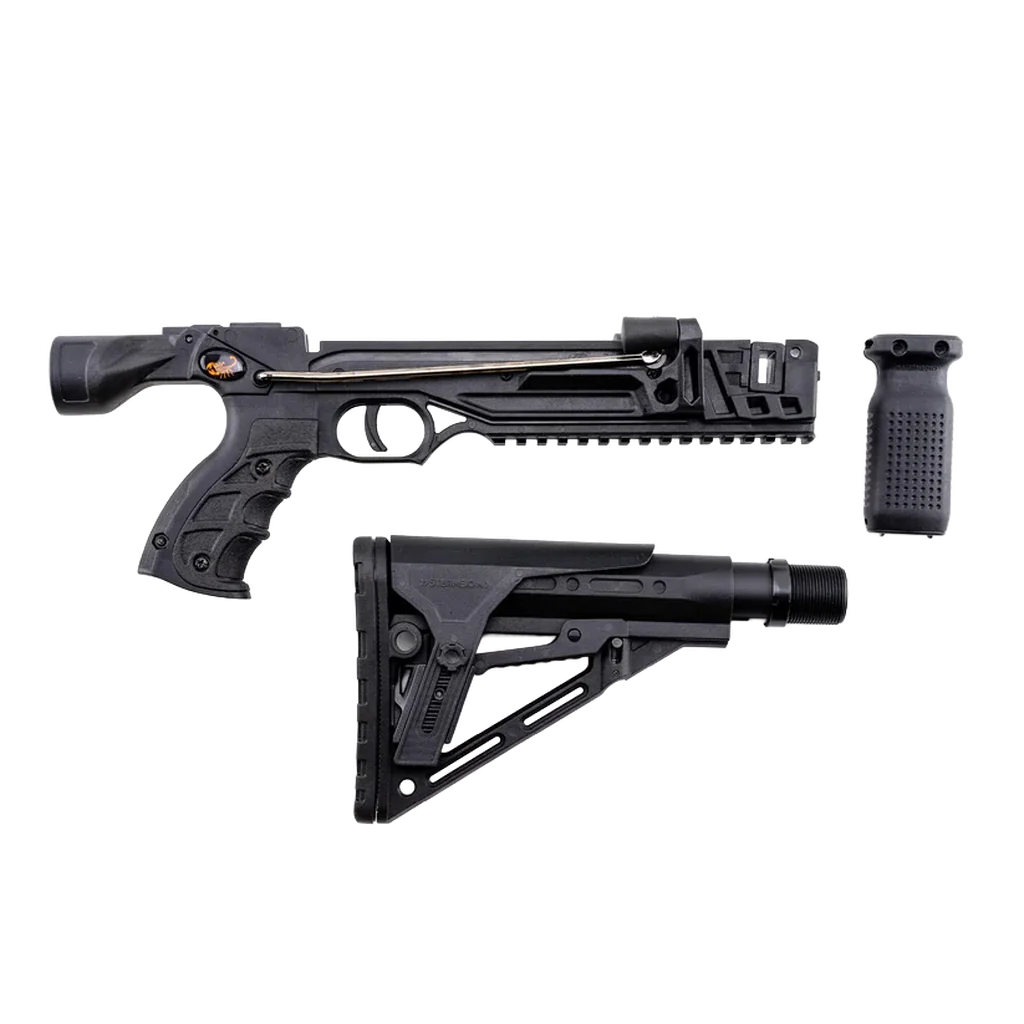 M10 Shoulder stock with cheek rest, string dampeners, front grip with internal compartment, and tuning trigger