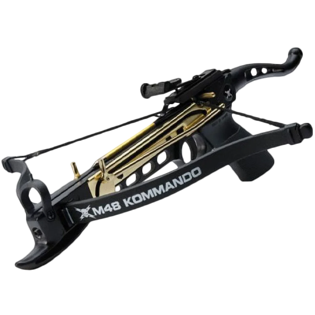 M48 Kommando Tactical Pistol Crossbow, Self-Cocking, approx. 80 Lbs Draw Weight, United Cutlery This fully functional M48 Pistol Crossbow by United Cutlery will streak a steel-tipped bolt at more than 160 FPS (feet per second /approx. 49 m per second) and launch it more than 100 yards! Best of all, it is self-cocking, so no more contortions or pulledmuscles from the 80 lb. draw weight of this beast. It features an aluminum body and fiberglass limbs. Sighting, windage andelevation wheels click tune for accuracy. Delivery includes three 6 in. (approx. 15.5 cm) aluminum arrows and the packaging features cut-out targets for practice.